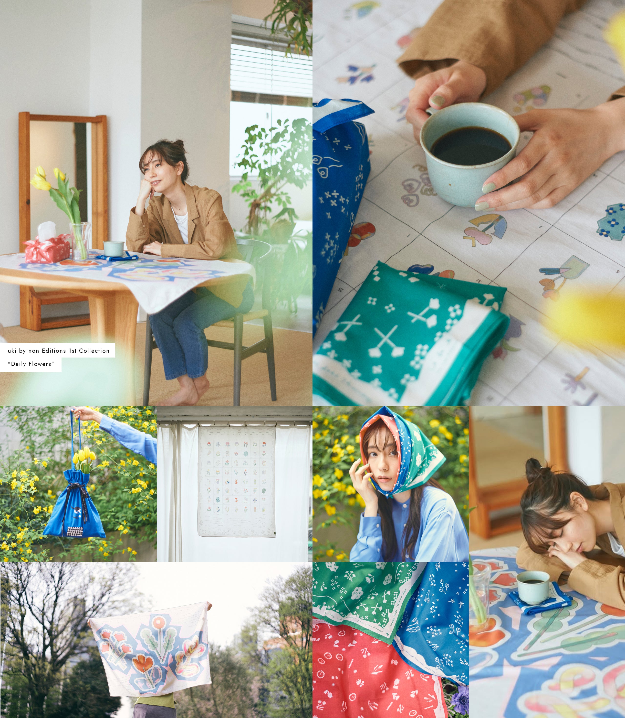 日めくりカレンダーや、マルチに使えるハンカチーフ、ファブリックポスターをラインナップ。さらに、ukiの花々とブランド立ち上げまでの日々をまとめたアートブックを出版致しました。